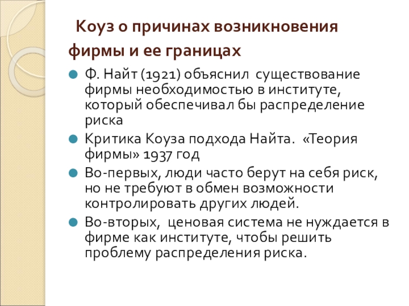 (1921) объяснил существование фирмы необходимостью в институте, который обеспечивал бы распределение риска