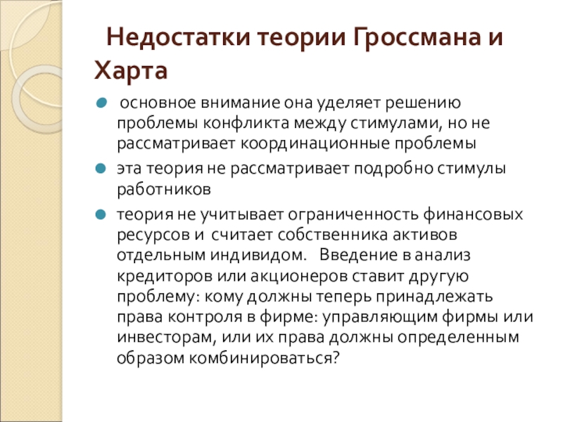 Слайд 31 Недостатки теории Гроссмана и Харта