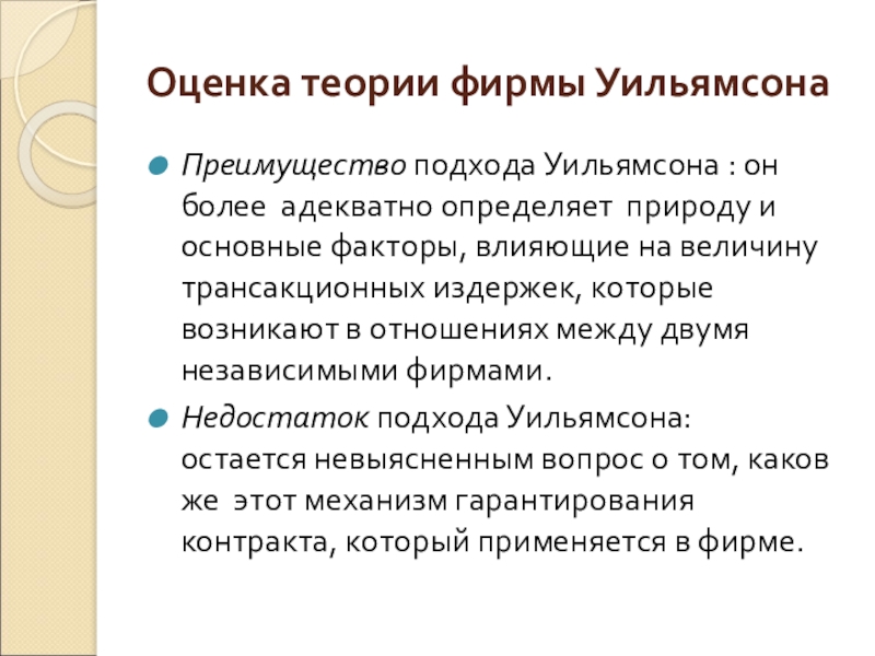 Слайд 22Оценка теории фирмы Уильямсона