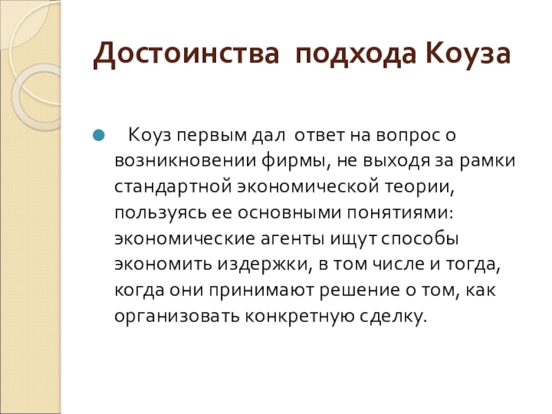 Слайд 9Достоинства подхода Коуза