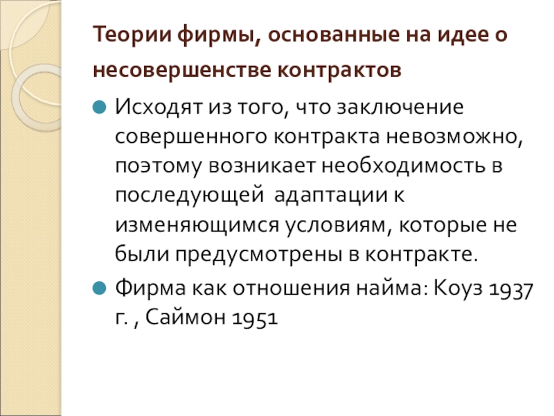 Слайд 16Теории фирмы, основанные на идее о несовершенстве контрактов