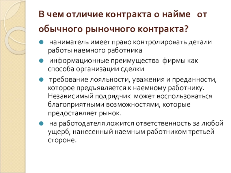 Слайд 18В чем отличие контракта о найме от обычного рыночного контракта?