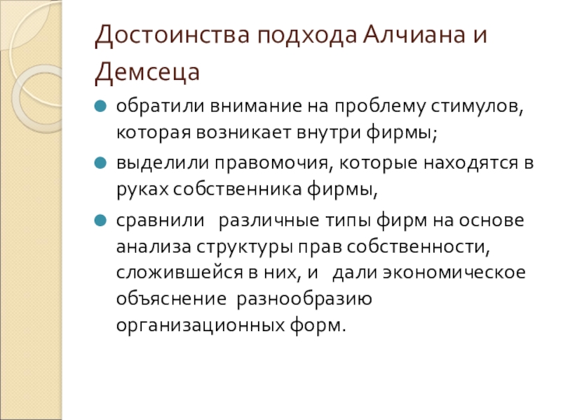 Слайд 14Достоинства подхода Алчиана и Демсеца