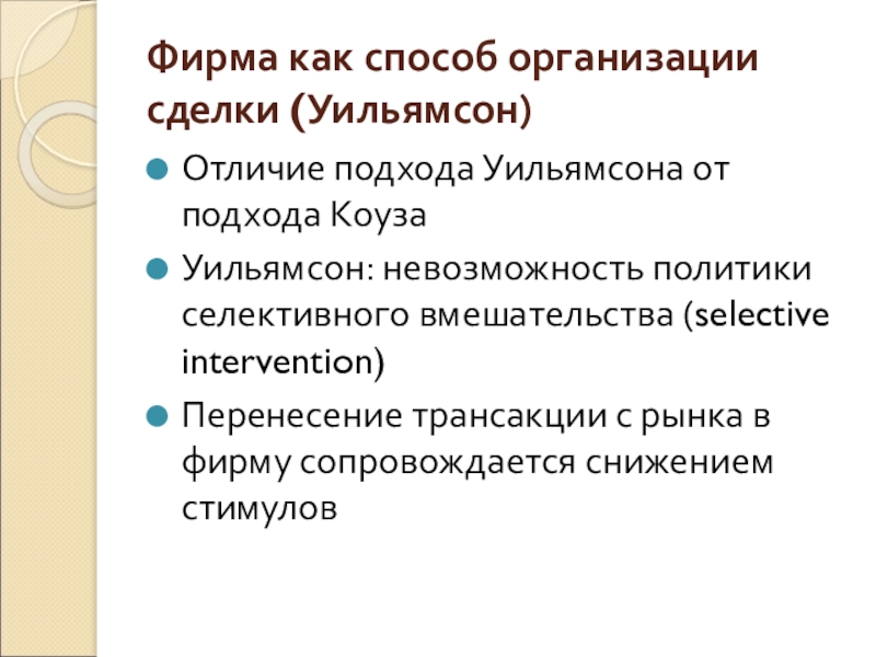 Слайд 20Фирма как способ организации сделки (Уильямсон)