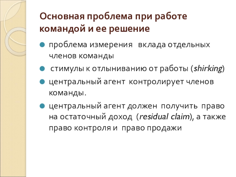 центральный агент должен получить право на остаточный доход (residual claim), а также право контроля и право продажи