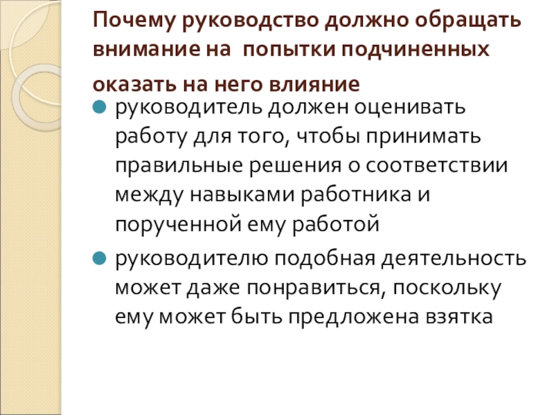 Слайд 24Почему руководство должно обращать внимание на попытки подчиненных оказать на него