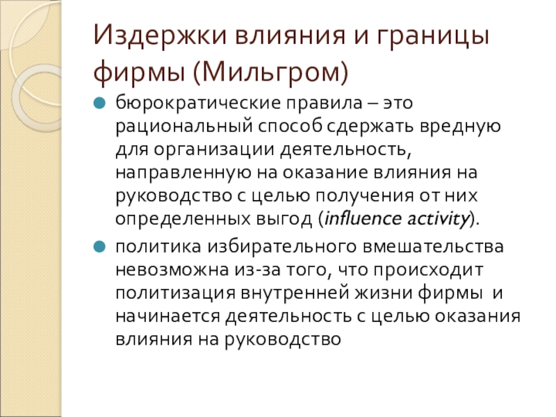 Слайд 23Издержки влияния и границы фирмы (Мильгром)