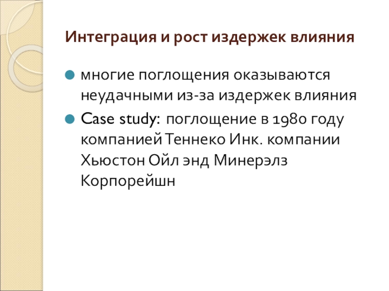 Издержки интеграции: стимулы поглощаемой фирмы к осуществлению специфических для данной сделки инвестиций снижаются, и это является издержками интеграции.