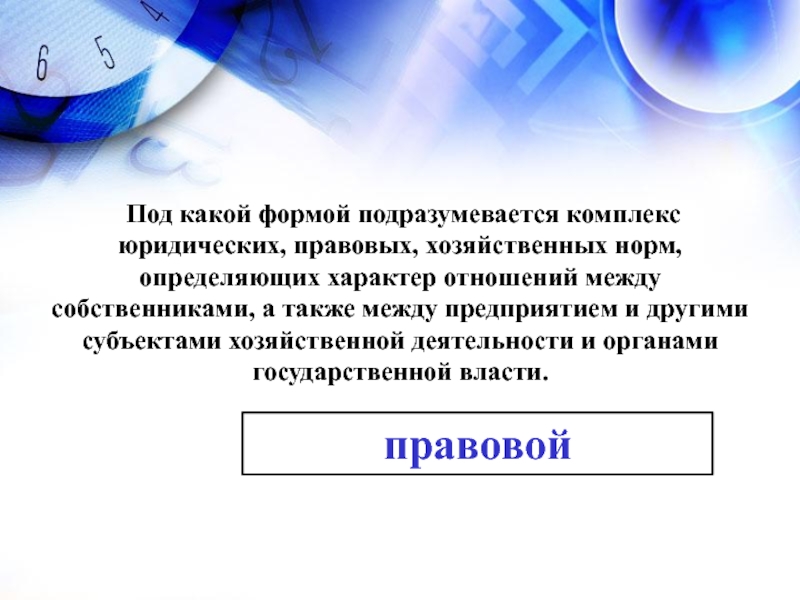 правовой Под какой формой подразумевается комплекс юридических, правовых, хозяйственных норм, определяющих характер отношений между собственниками, а также