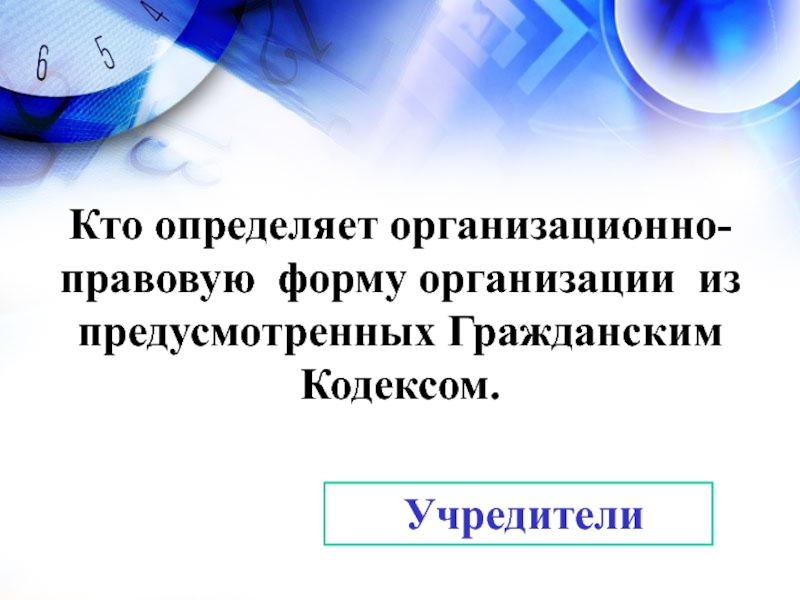 Учредители Кто определяет организационно-правовую форму организации из предусмотренных Гражданским Кодексом.