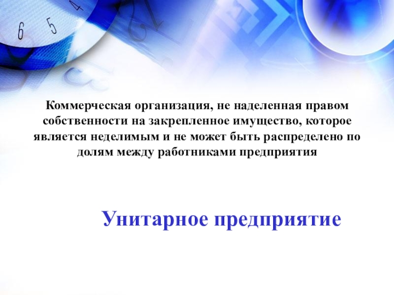 Унитарное предприятиеКоммерческая организация, не наделенная правом собственности на закрепленное имущество, которое является неделимым и не может быть