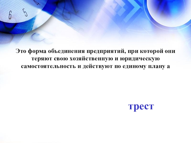 трестЭто форма объединения предприятий, при которой они теряют свою хозяйственную и юридическую самостоятельность и действуют по единому