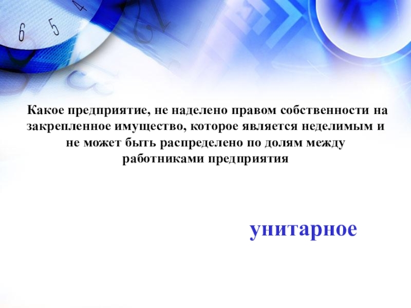унитарноеКакое предприятие, не наделено правом собственности на закрепленное имущество, которое является неделимым и не может быть распределено