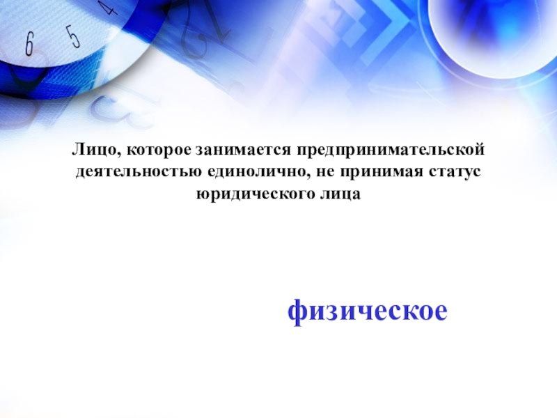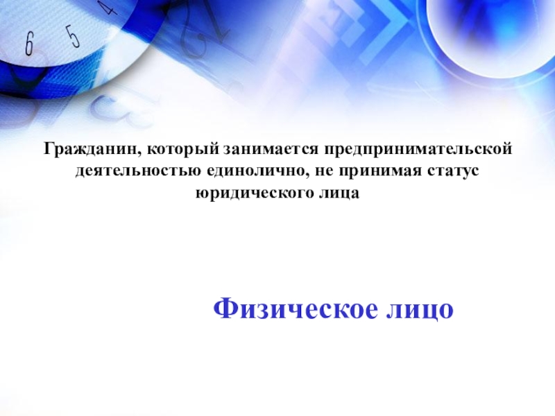 Физическое лицоГражданин, который занимается предпринимательской деятельностью единолично, не принимая статус юридического лица