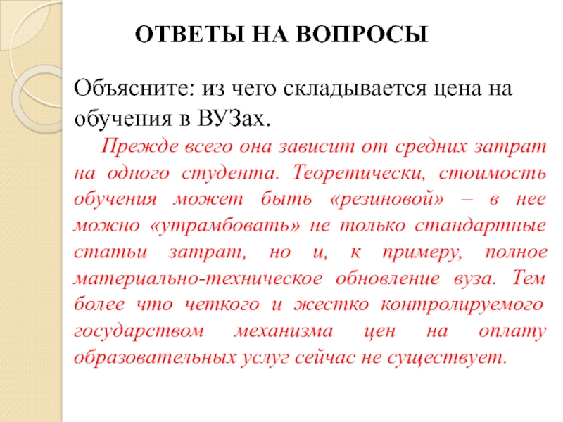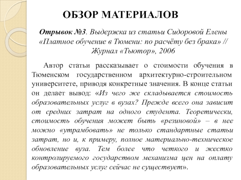 Автор статьи рассказывает о стоимости обучения в Тюменском государственном архитектурно-строительном университете, приводя конкретные значения. В конце статьи он делает вывод: «Из чего же складывается стоимость образовательных услуг в вузах? Прежде всего она зависит от средних затрат на одного студента. Теоретически, стоимость обучения может быть «резиновой» – в нее можно «утрамбовать» не только стандартные статьи затрат, но и, к примеру, полное материально-техническое обновление вуза. Тем более что четкого и жестко контролируемого государством механизма цен на оплату образовательных услуг сейчас не существует».