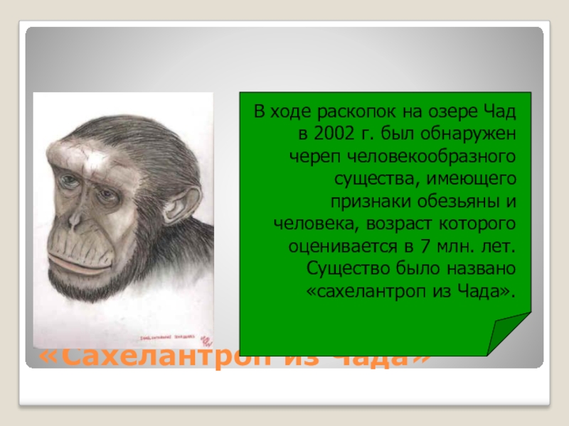 был обнаружен череп человекообразного существа, имеющего признаки обезьяны и человека, возраст которого оценивается в 7 млн. лет. Существо было названо «сахелантроп из Чада».