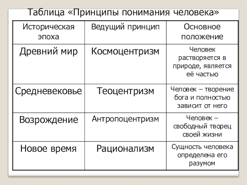 Слайд 9Таблица «Принципы понимания человека»