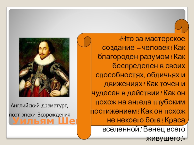 человек! Как благороден разумом! Как беспределен в своих способностях, обличьях и движениях! Как точен и чудесен в действии! Как он похож на ангела глубоким постижением! Как он похож не некоего бога! Краса вселенной! Венец всего живущего!»