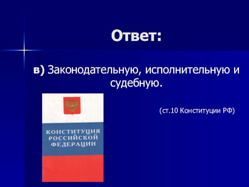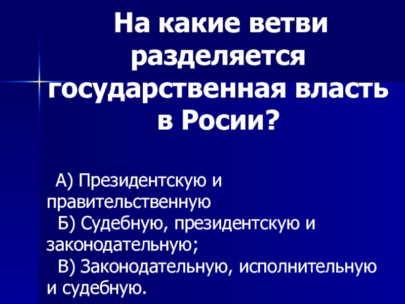 Слайд 11 На какие ветви разделяется государственная власть в Росии?