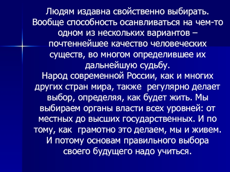Народ современной России, как и многих других стран мира, также регулярно делает выбор, определяя, как будет жить. Мы выбираем органы власти всех уровней: от местных до высших государственных. И по тому, как грамотно это делаем, мы и живем. И потому основам правильного выбора своего будущего надо учиться.