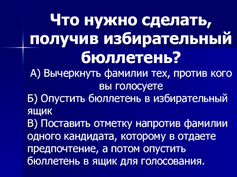 Слайд 46Что нужно сделать, получив избирательный бюллетень?