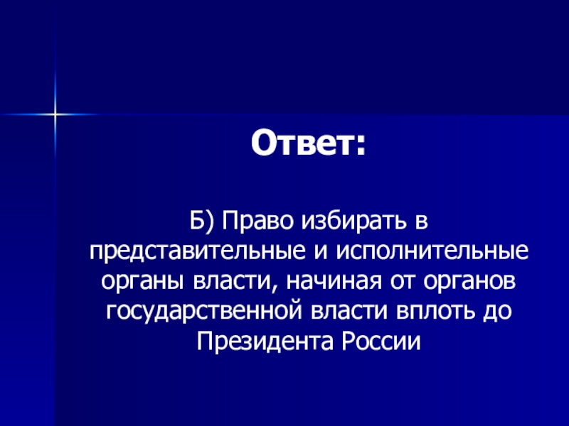 Б) Право избирать в представительные и исполнительные органы власти, начиная от органов государственной власти вплоть до Президента России