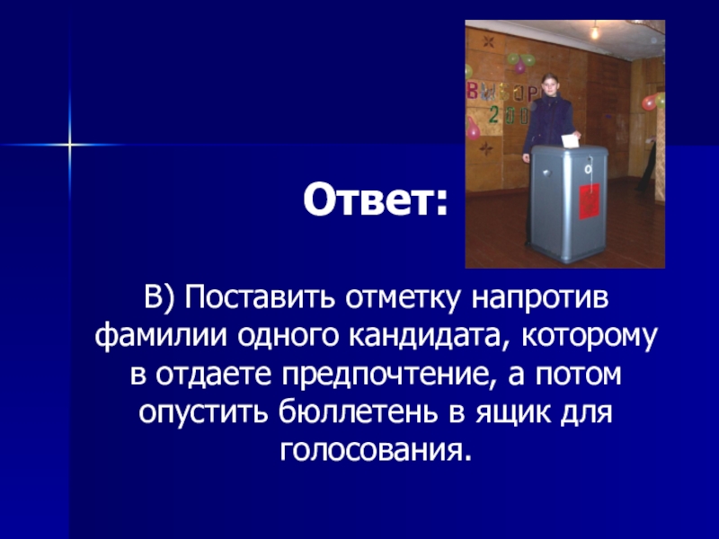 В) Поставить отметку напротив фамилии одного кандидата, которому в отдаете предпочтение, а потом опустить бюллетень в ящик для голосования.
