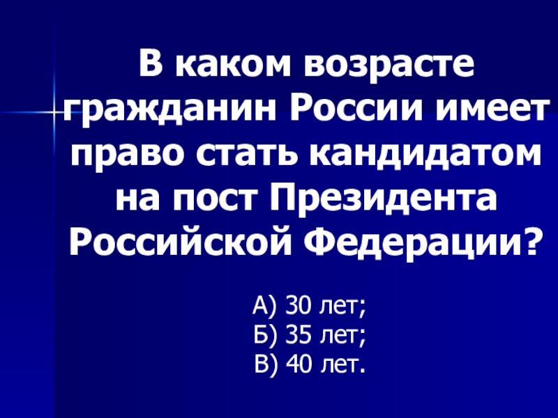Слайд 39В каком возрасте гражданин России имеет право стать кандидатом на пост