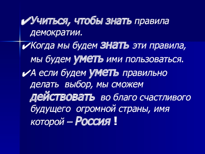 Слайд 3Учиться, чтобы знать правила демократии.