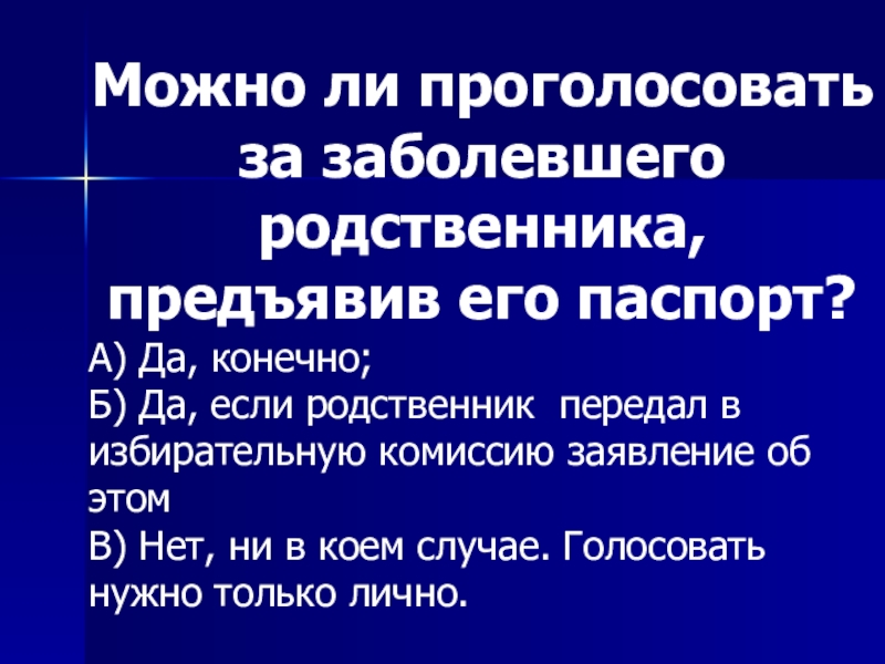 Слайд 50Можно ли проголосовать за заболевшего родственника, предъявив его паспорт?