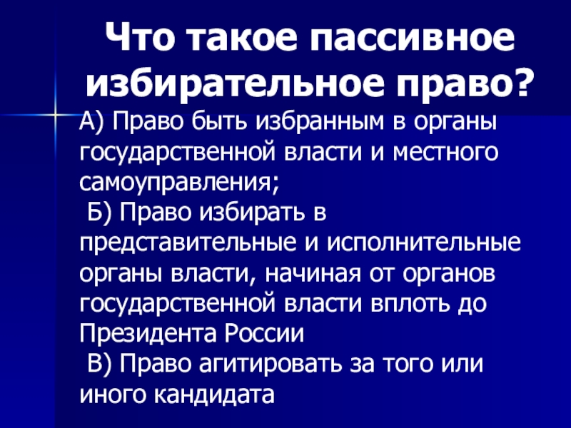 Слайд 35Что такое пассивное избирательное право?