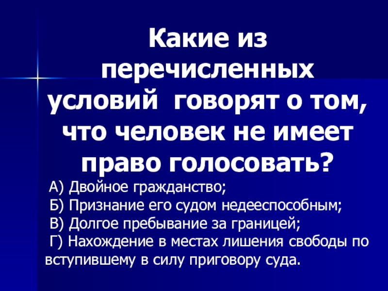 Слайд 33Какие из перечисленных условий говорят о том, что человек не имеет