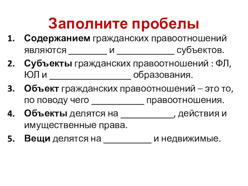 Заполните пробелыСодержанием гражданских правоотношений являются ________ и ____________ субъектов.Субъекты гражданских правоотношений : ФЛ, ЮЛ и _________________ образования.Объект