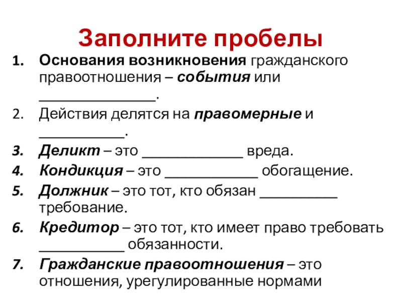 Заполните пробелыОснования возникновения гражданского правоотношения – события или _______________.Действия делятся на правомерные и ___________.Деликт – это _____________