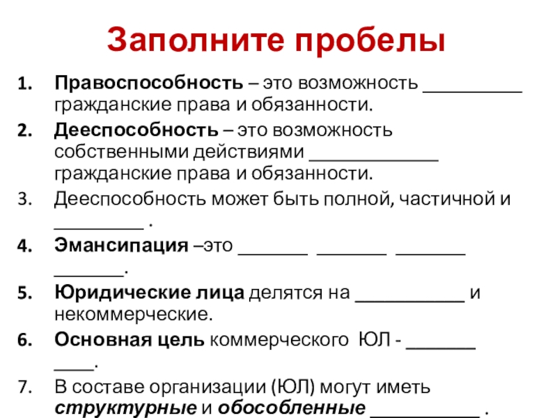 Заполните пробелыПравоспособность – это возможность __________ гражданские права и обязанности.Дееспособность – это возможность собственными действиями _____________ гражданские