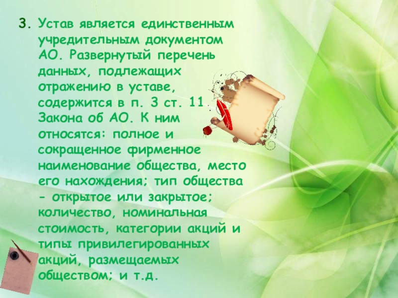 Слайд 213. Устав является единственным учредительным документом АО. Развернутый перечень данных, подлежащих
