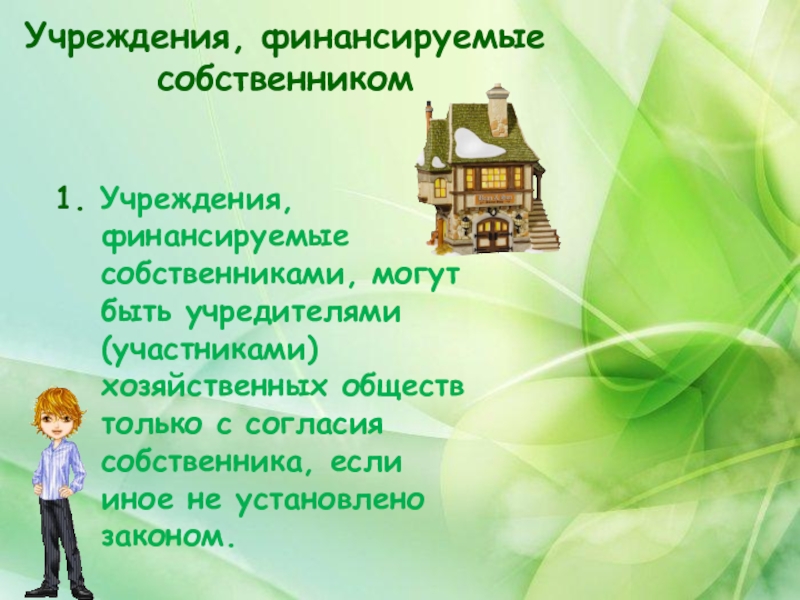 1. Учреждения, финансируемые собственниками, могут быть учредителями (участниками) хозяйственных