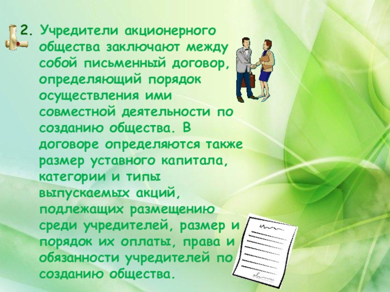 Слайд 202. Учредители акционерного общества заключают между собой письменный договор, определяющий порядок