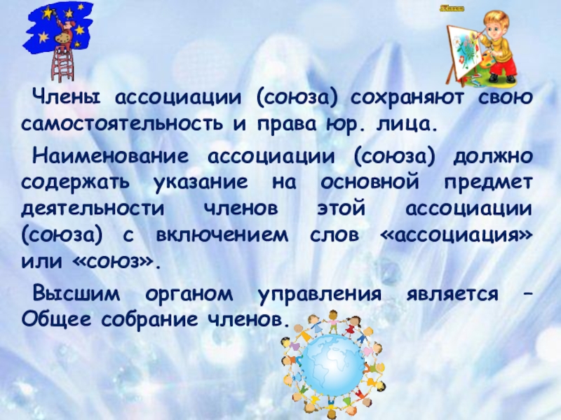 Слайд 26Члены ассоциации (союза) сохраняют свою самостоятельность и права юр. лица.