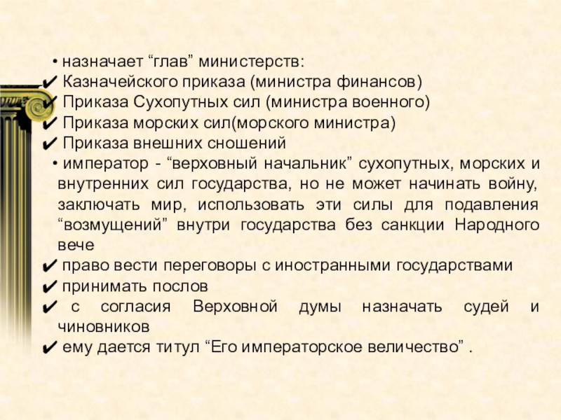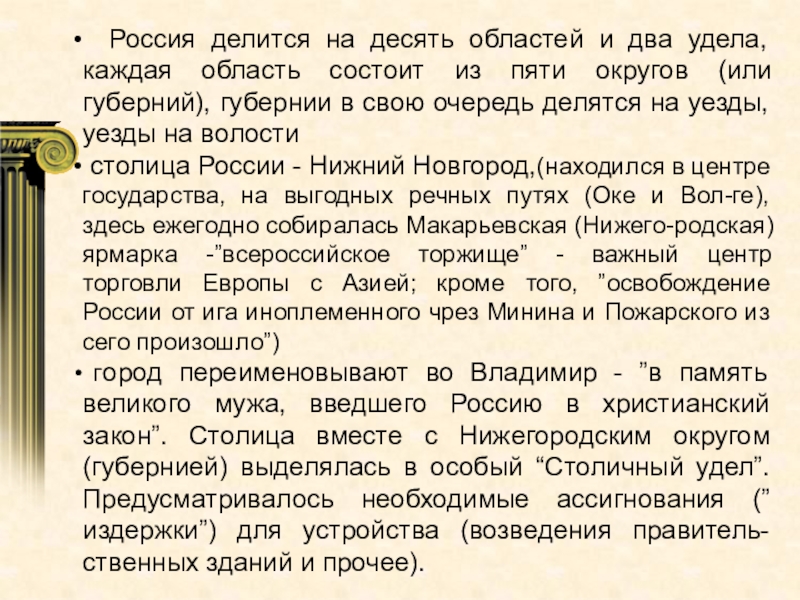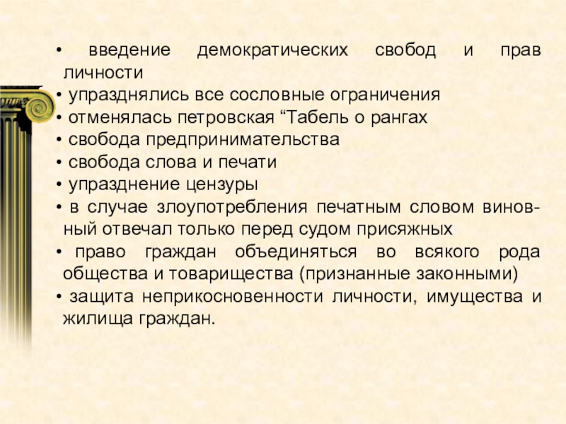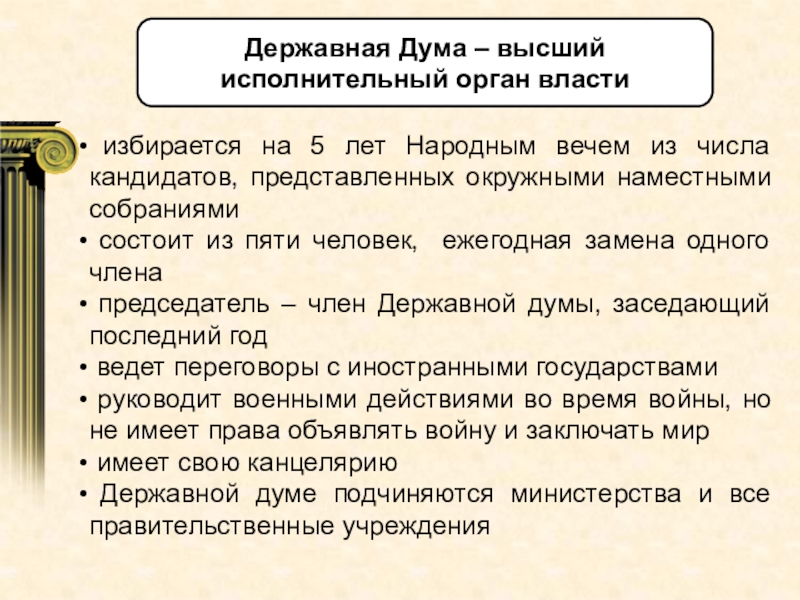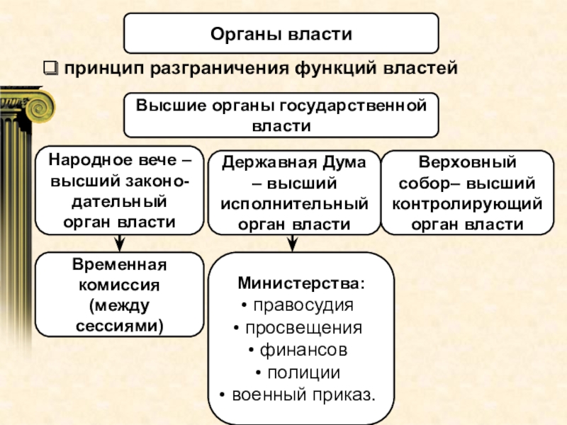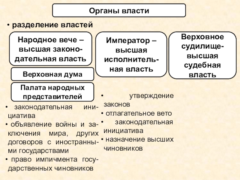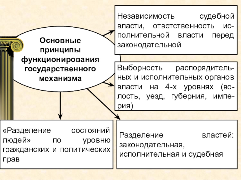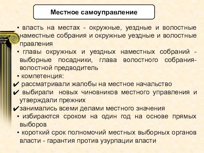 Выборность распорядитель-ных и исполнительных органов власти на 4-х уровнях (во-лость, уезд, губерния, импе-рия)