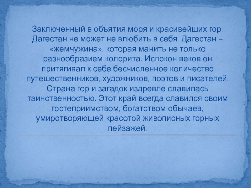 Слайд 2Заключенный в объятия моря и красивейших гор, Дагестан не может не