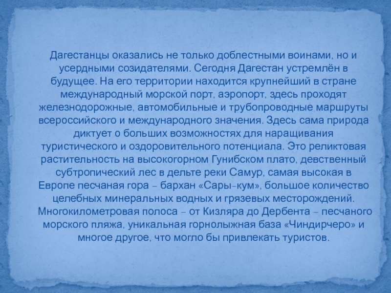 Слайд 27Дагестанцы оказались не только доблестными воинами, но и усердными созидателями. Сегодня