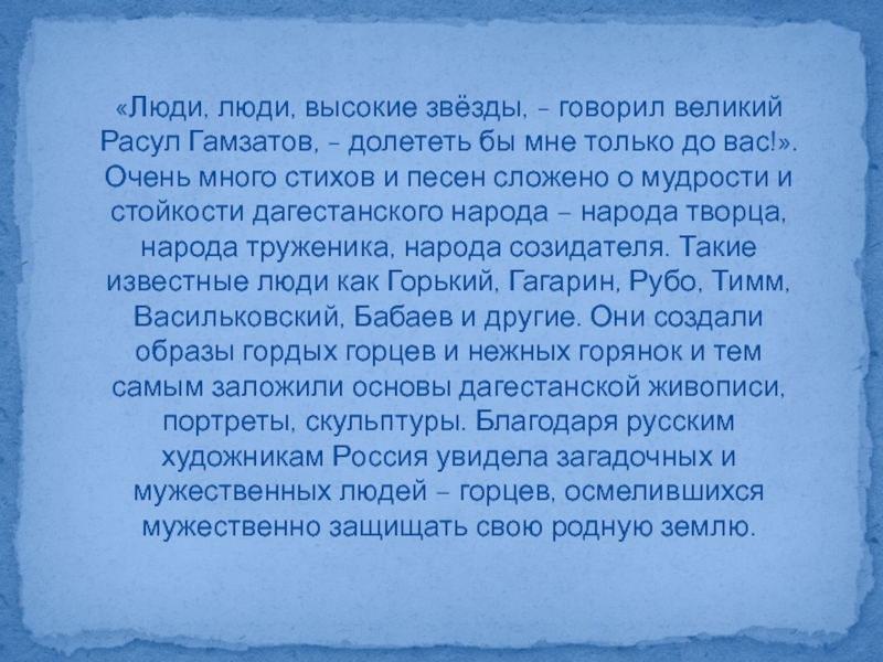 бы мне только до вас!». Очень много стихов и песен сложено о мудрости и стойкости дагестанского народа – народа творца, народа труженика, народа созидателя. Такие известные люди как Горький, Гагарин, Рубо, Тимм, Васильковский, Бабаев и другие. Они создали образы гордых горцев и нежных горянок и тем самым заложили основы дагестанской живописи, портреты, скульптуры. Благодаря русским художникам Россия увидела загадочных и мужественных людей – горцев, осмелившихся мужественно защищать свою родную землю.
