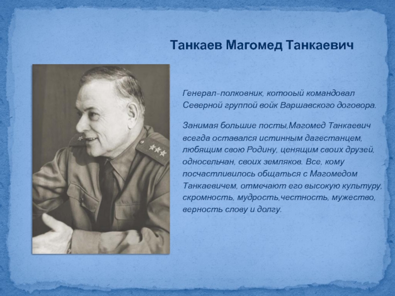 всегда оставался истинным дагестанцем, любящим свою Родину, ценящим своих друзей, односельчан, своих земляков. Все, кому посчастливилось общаться с Магомедом Танкаевичем, отмечают его высокую культуру, скромность, мудрость,честность, мужество, верность слову и долгу.