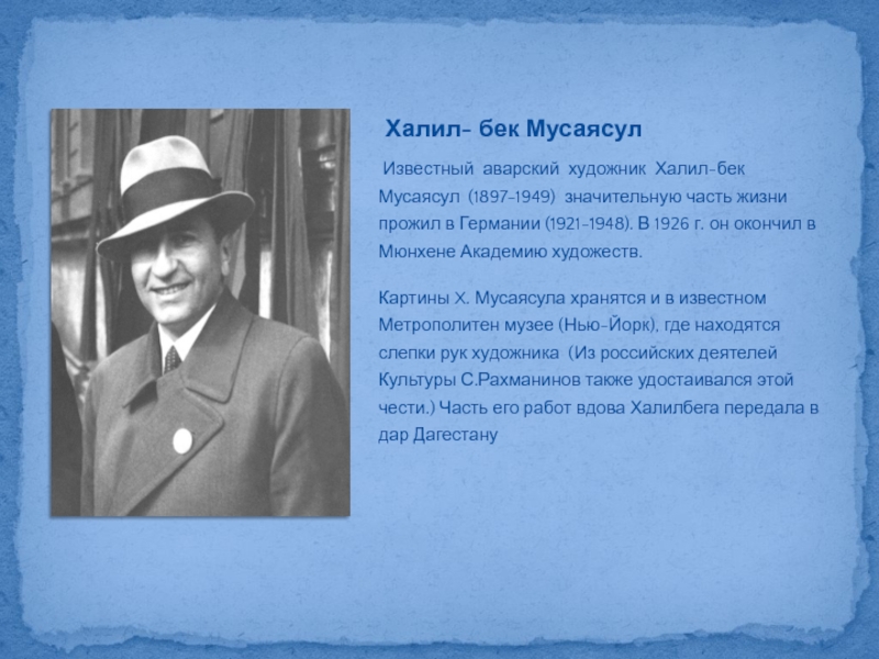 Слайд 23 Известный аварский художник Халил-бек Мусаясул (1897-1949) значительную часть жизни прожил