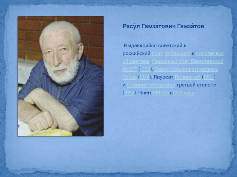 Слайд 21 Выдающийся советский и российский поэт, публицист и политический деятель. Народный поэт Дагестанской АССР (1959). Герой Социалистического Труда (1974). Лауреат Ленинской (1963)