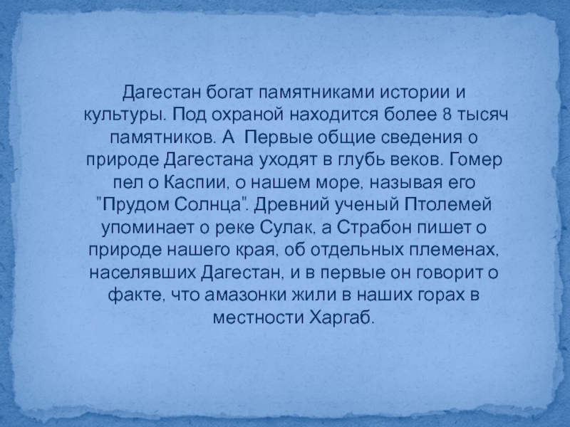 тысяч памятников. А Первые общие сведения о природе Дагестана уходят в глубь веков. Гомер пел о Каспии, о нашем море, называя его "Прудом Солнца". Древний ученый Птолемей упоминает о реке Сулак, а Страбон пишет о природе нашего края, об отдельных племенах, населявших Дагестан, и в первые он говорит о факте, что амазонки жили в наших горах в местности Харгаб.