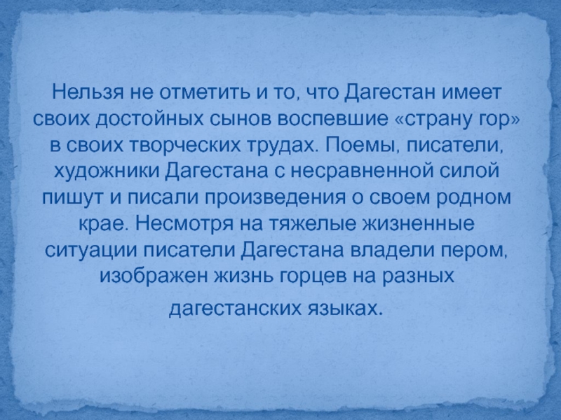 воспевшие «страну гор» в своих творческих трудах. Поемы, писатели, художники Дагестана с несравненной силой пишут и писали произведения о своем родном крае. Несмотря на тяжелые жизненные ситуации писатели Дагестана владели пером, изображен жизнь горцев на разных дагестанских языках.