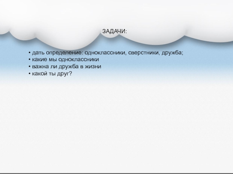 ЗАДАЧИ: дать определение: одноклассники, сверстники, дружба; какие мы одноклассники важна ли дружба в жизни какой ты друг?
