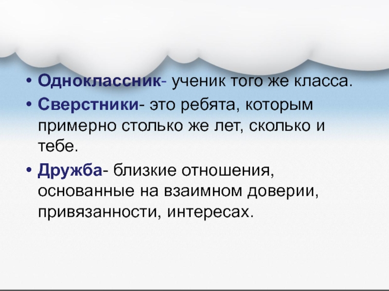 Одноклассник- ученик того же класса.Сверстники- это ребята, которым примерно столько же лет, сколько и тебе.Дружба- близкие отношения,